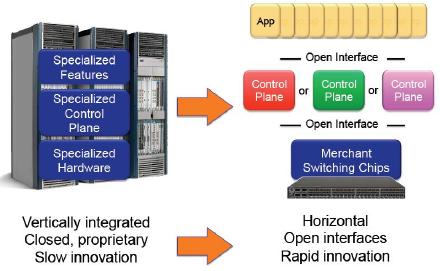 Software Defined Networking是Kate Greene 创造的一个词,在大约2009年提出的。它是指网络的控制平面与实际的物理上的拓扑结构互相分离。这种分离可以使控制平面用一种不同的方式实现,比如分布式的实现方式;另外,它还可以改变控制平面的运行环境,比如不再运行在传统的交换机上的那种低功耗CPU上。