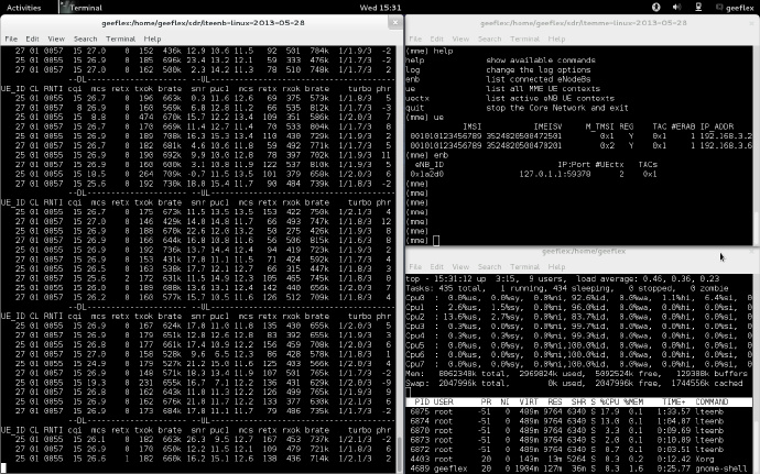 下图是AmariLTE运行时的截图。此时,两个LTE手机正在进行skype视频通话。左图是eNB的界面,显示了当前eNB下的UE的连接状况,上下行throughput, SNR,MCS,Turbo迭代次数等等。右上图是MME的界面,显示了当前eNB和UE的状态。右下图显示的是CPU占用率。这台计算机使用的是Intel(R) Core(TM) i7-3770 CPU @ 3.40GHz。可以看到CPU的占用率并不高,大约在30%多。