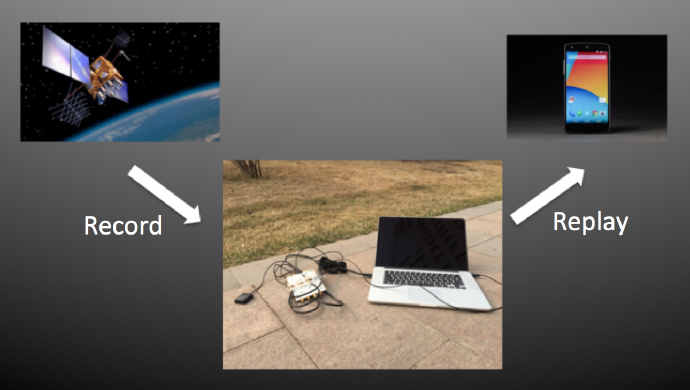 过去做一个GPS模拟器并不是一件容易的事,GPS信号有复杂的格式,发射方法。一个商用级的GPS模拟器售价高达百万元人民币。比较简单的一种方法是“重放攻击”,也就是录制一段GPS信号,然后再播放出来,就像下图的示例。