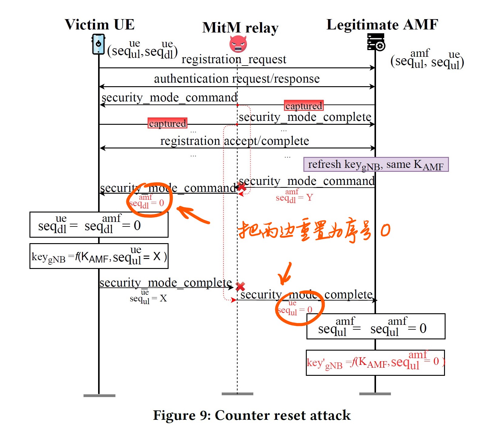 DoS类和账单欺诈。为了防重放攻击,NAS层的数据包有序列号,序列号就有溢出重置的情况。这个攻击方法就是用中间人(伪基站+伪终端),首先保存一次0号数据包(Security Mode Command 和 Security Mode Complete),然后再某个合适的时间重放一次,于是终端(UE,User Equipment)与网络(AMF: Mobility Management Function)的连接的counter就失去同步了,然后连接中断,终端会重新发起连接建立。“Causing DoS and user-battery depletion”。前面说了DoS类攻击确实是存在的,不用过于忧虑。